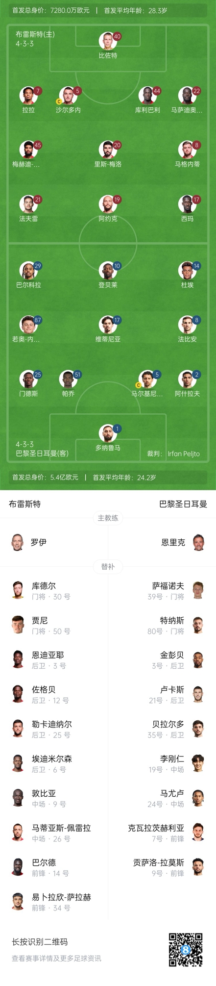 布雷斯特替補:30-庫代爾、50-諾亞-強尼、3-恩迪亞耶、6-埃迪米爾松-費爾南德斯、9-多姆比亞、12-佐格貝、14-瑪瑪-巴爾德、25-勒卡迪那、26-拉熱、34-易卜拉欣-薩拉赫