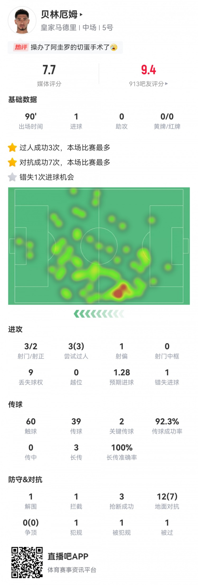 2月12日訊 歐冠淘汰賽附加賽首回合,曼城主場2-3遭皇馬絕殺。此役絕殺功臣貝林厄姆首發(fā)打滿全場,球員全場重點(diǎn)數(shù)據(jù)如下↓