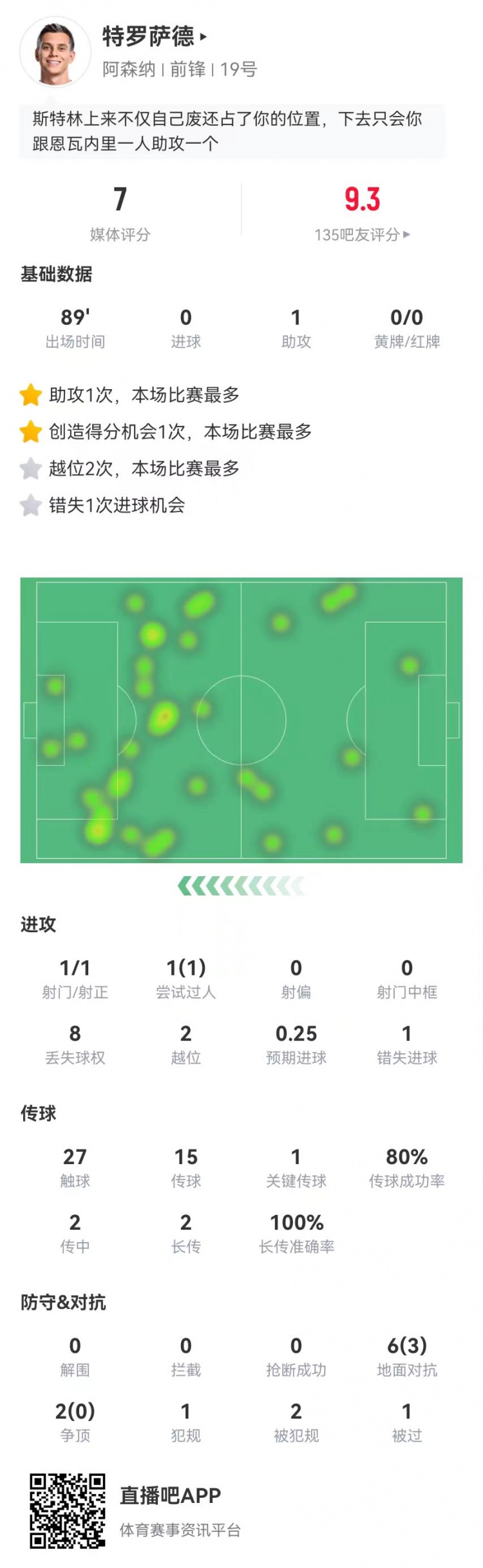 2月15日訊 阿森納在本輪英超2-0擊敗萊斯特城,特羅薩德本場數(shù)據(jù)如下:
